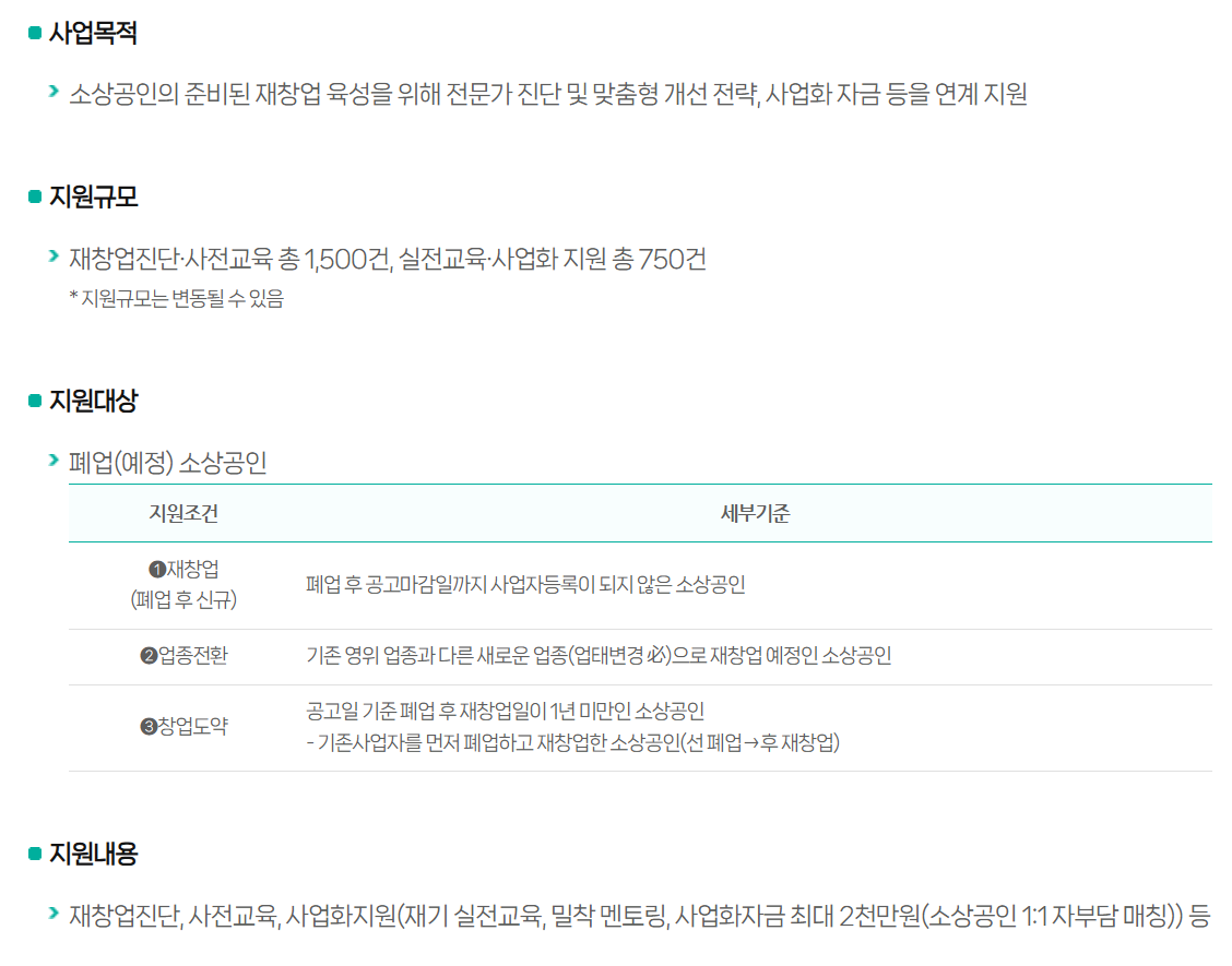 | 교육 대상 | 재창업 또는 업종 전환 의사가 있는 폐업(예정) 소상공인 |